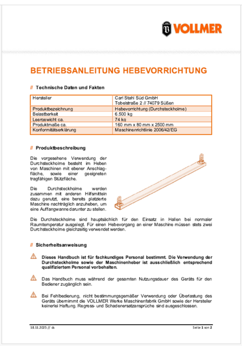 The lifting-beam must be returned to Vollmer no later than 3 days after the machine tool is put into operation (Incoterm 2020® DAP Biberach). Vollmer must be notified of the return shipment in advance.