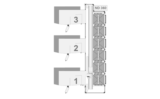 Le système de manutention ND 360 est la solution idéale pour tous ceux qui misent sur une efficacité maximale. Quatre axes CNC commandent les mouvements, les doubles-grappins assurent des temps d'échange particulièrement courts et 6 chariots de chargement garantissent le chargement automatique de jusqu'à 550 lames de scies circulaires.