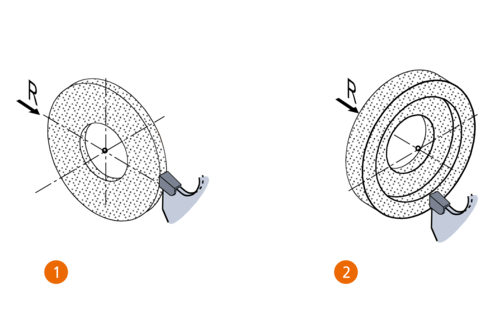 Przy obróbce erozyjnej elektrodą obrotową lub przy erozji obrotowej usuwanie materiału następuje pomiędzy elektrodą dyskową a krawędzią tnącą z PCD przy zachowaniu minimalnej szczeliny roboczej.